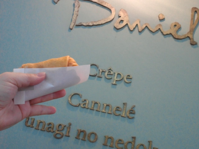 Daniel お店の前に少し行列が出来てて前で食べてる若者もいてみどりさんも何かしら?と言ってたので聞いたら小さなクレープとのこと。並びました♪原宿などにあるようなクレープとは全然違ってクレープで巻いたケーキ…うーん表現が難しいですが今まで食べたクレープのカテゴリーの中ではダントツにワタシは美味しかったです♪ワタシはイチジクにタピオカ入りのクリーム、カスタードは全部に入るみたいです。めちゃウマウマでしたー♪