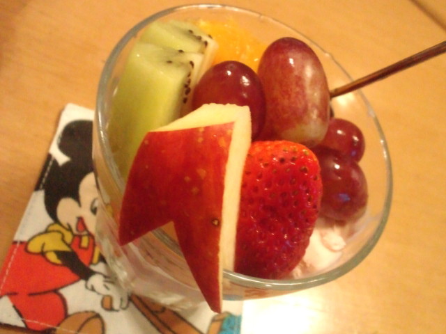 人間もデザート パパリクエストでまたまたパフェ〜♪いちごにいちごアイスがやっぱうまーい!(笑)アイス見えてませんがいちごアイスにコーンフレーク(プレーン)が入ってますよーいちごも下にたくさん入れてみましたーりんごもウサギだよー(笑)